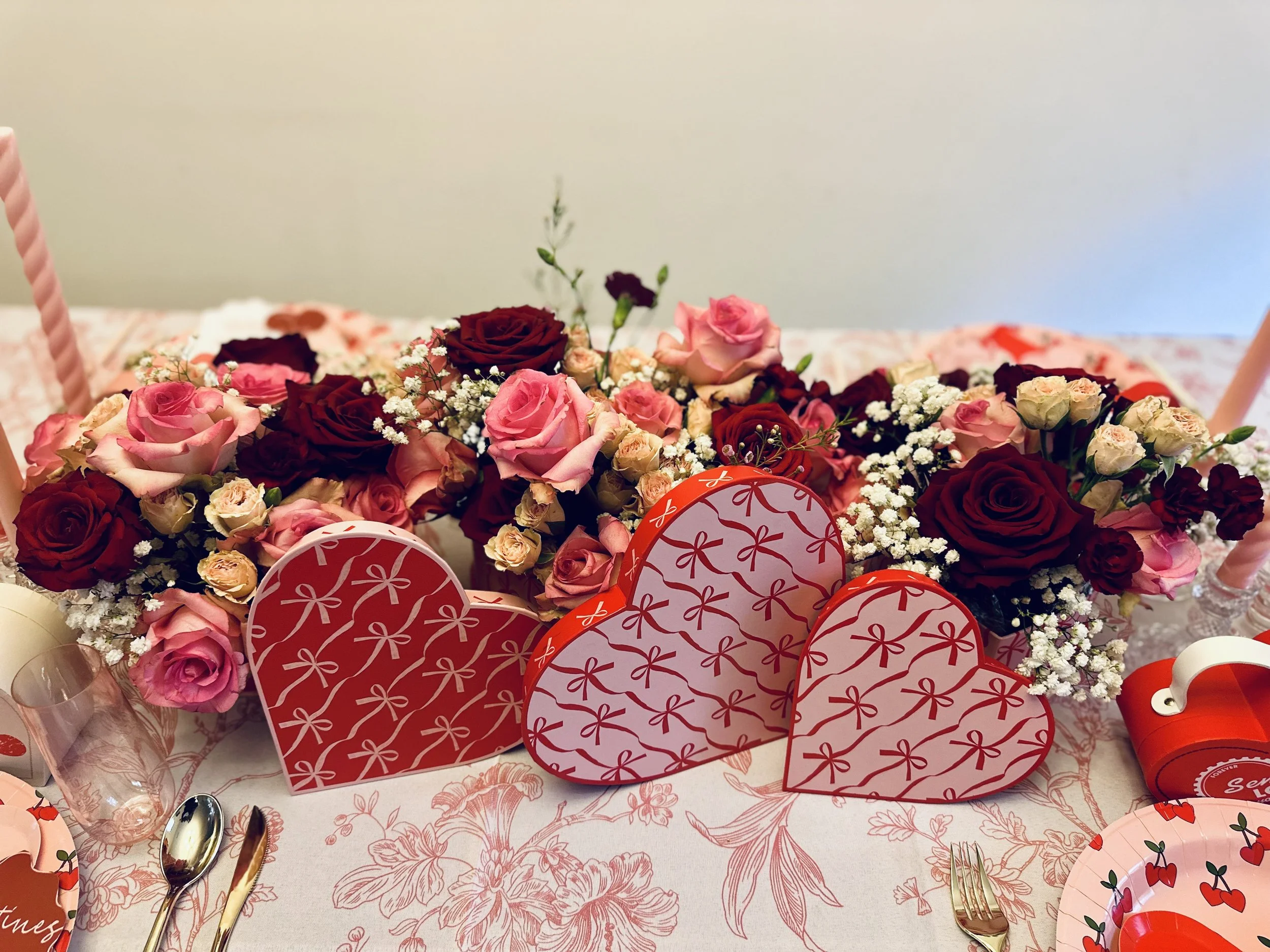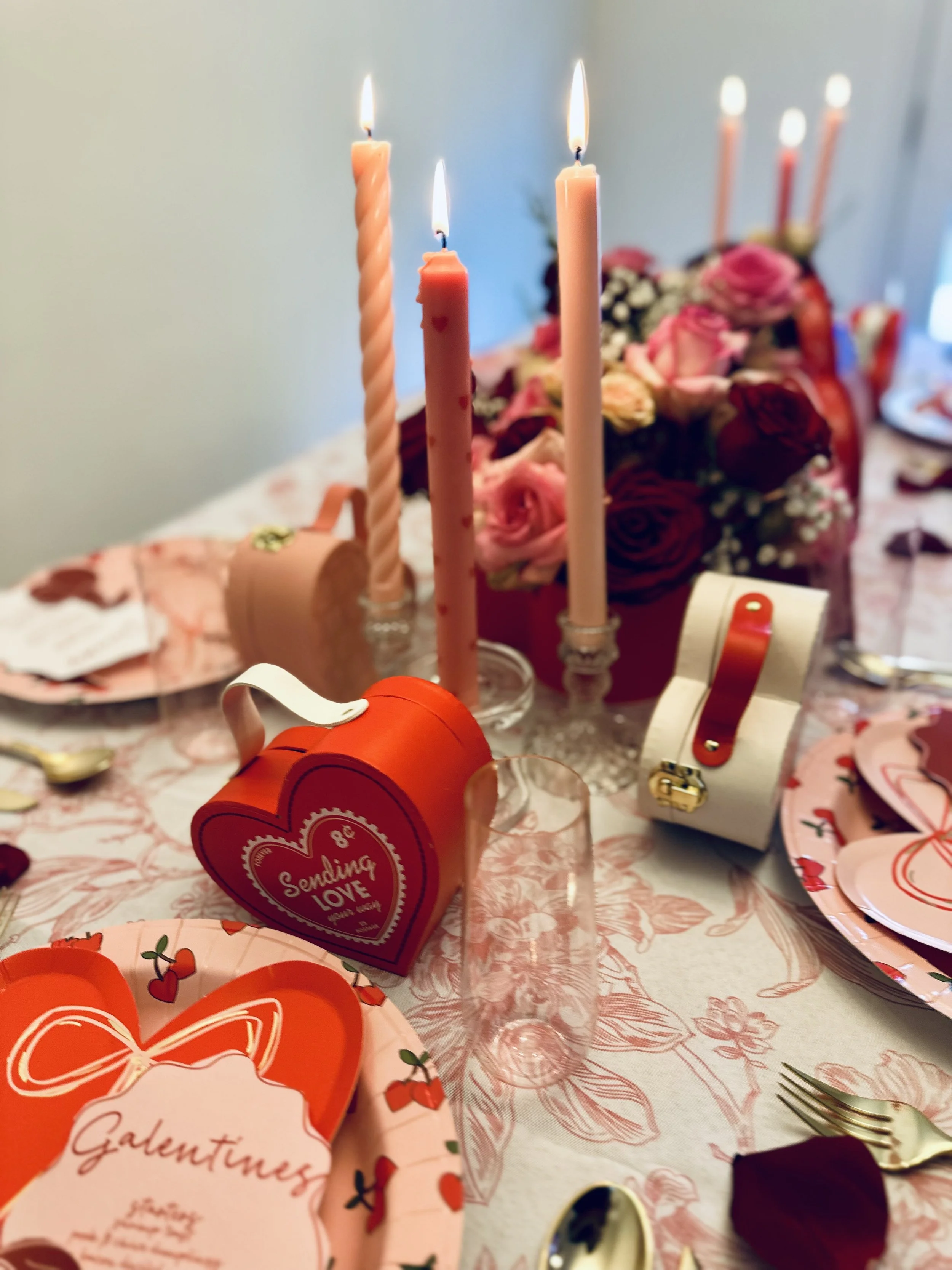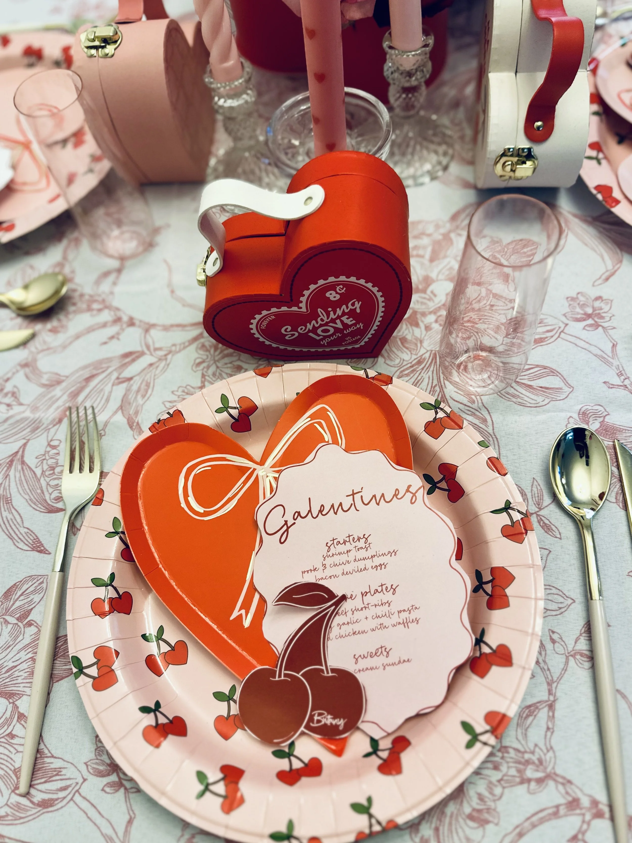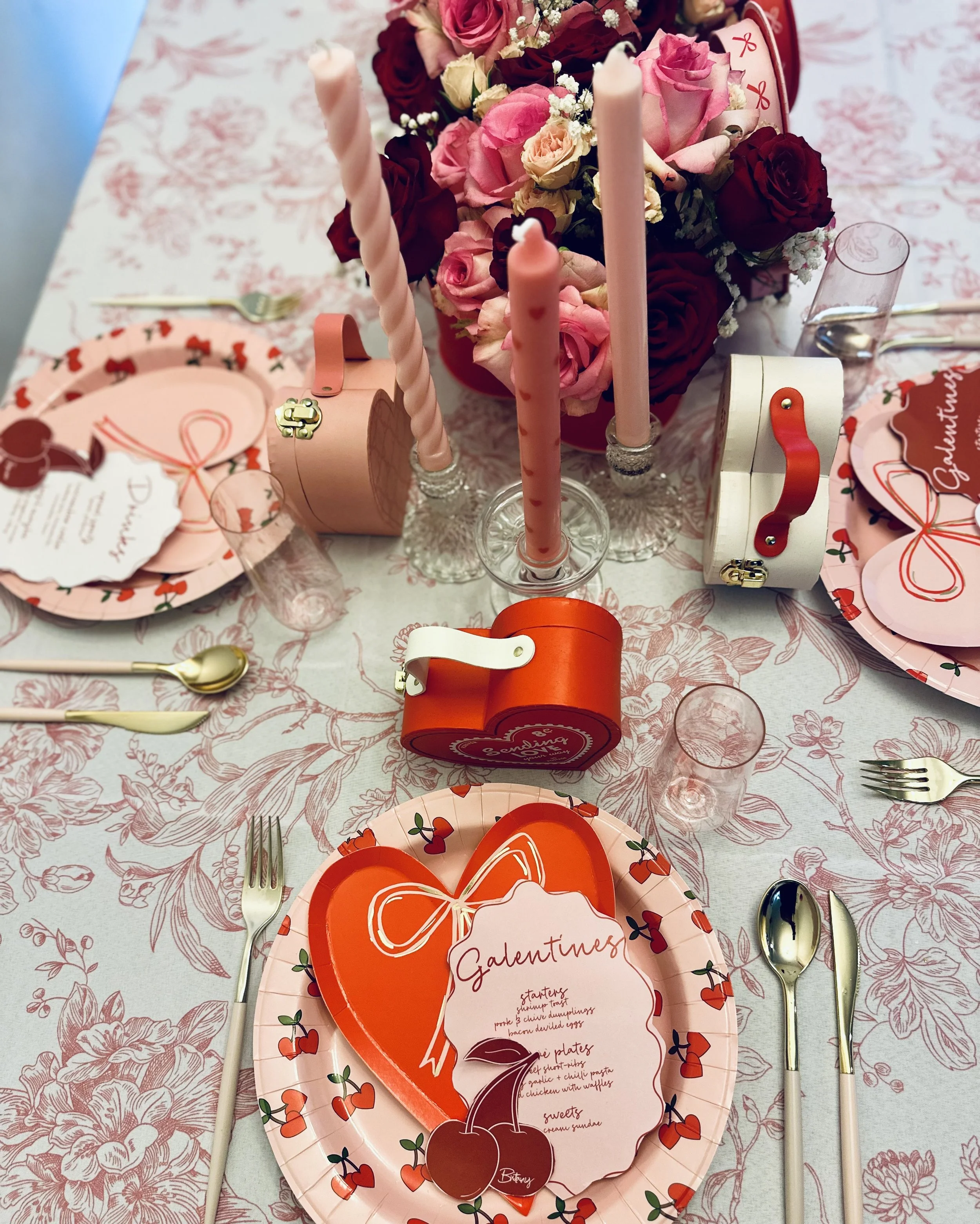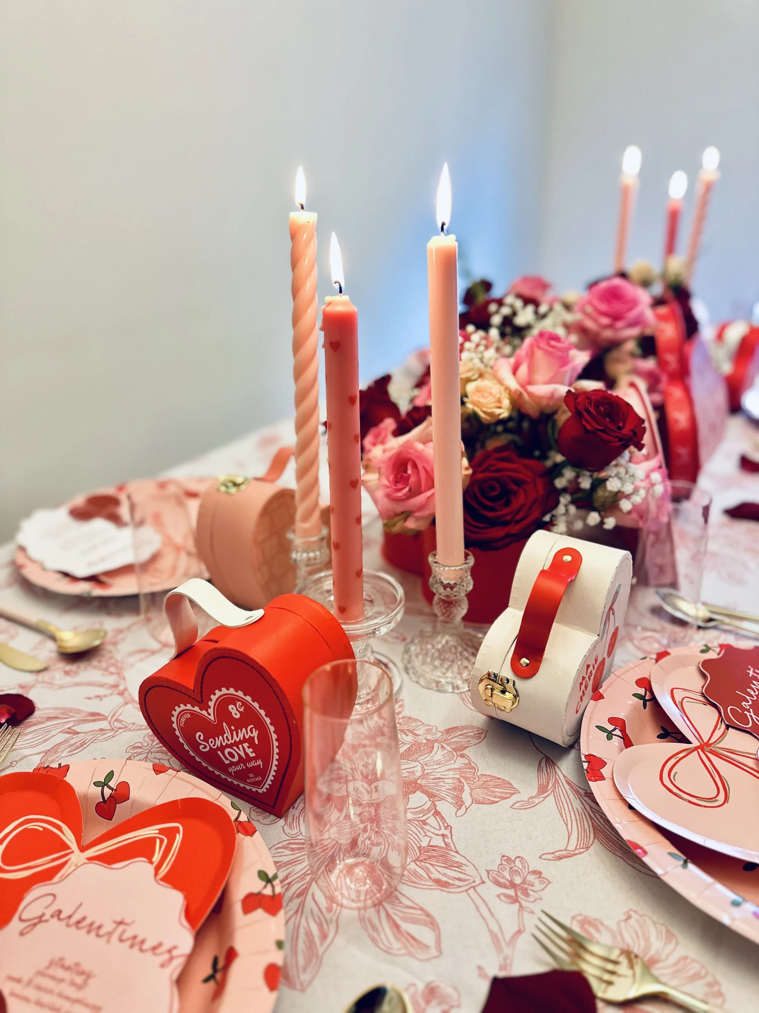 If this "Mon Cheri" theme has inspired you to create your own Galentine’s Day table, I’ve got you covered! The beautiful heart boxes for the flowers and plates were from TJ Maxx. As soon as I saw them, I knew what direction I was going. The tablecloth were sourced from CV Linens, offering a great way to add an elegant touch without breaking the bank. It’s also one of the places I first started using for my business and has not failed me yet. The glassware for the champagne toast was from Oriental Trading, they have such great little hidden gems! And of course, my favors including those heart boxes suitcases were picked out from the Target Dollar Spot, so no breaking the bank here.